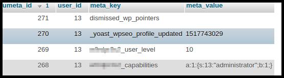 Auffällig ist das Registrierdatum „0000-00-00 00:00:00“ - daran erkennt man recht zuverlässig, hier etwas nicht stimmt. Ein 100%iges Zeichen ist das allerdings nicht. Admin-Accounts, die via XSS angelegt wurden, sehen ganz normal aus. Die einfachste Regel ist hier folgenden: Lösch alle Accounts, die dir nicht bekannt vorkommen - über die wp_usermeta kann man zu jeder user ID rausfinden, welche Rechte sie hat. Auffällig sind die, die das „user level“ 10 haben - das entspricht einem Administrator. Das ist allerdings kein ausreichendes Kriterium - noch genauer ist der prefix_capabilities-Wert: