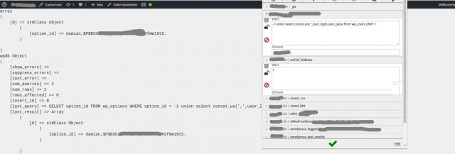 Fazit für mich: Der Großteil wird via POST/GET übertragen und vermutlich recht erfolgreich abgewehrt. Lässt sich via Cookie oder Server-Variable etwas in eine Query schleusen, hilft einem auch WordFence nicht weiter. Man könnte hier noch weiter versuchen, das Passwort auch via GET/POST zu bekommen. Mich würde nicht wundern, wenn es einen Weg gäbe, die Sicherheitsvorkehrungen zu umgehen. Wichtig ist auch zu wissen, dass es sehr stark auf die Art der SQL Injection ankommt. In meinem Fall habe ich eine gewählt, bei der nach „WHERE“ eigene Daten dazu kommen. Für den äußerst seltenen Fall, dass man die Tabelle selbst verändern kann, d.h. kein „FROM“ und kein „UNION“ nötig ist, wird man wohl auch via GET/POST erfolgreich sein.